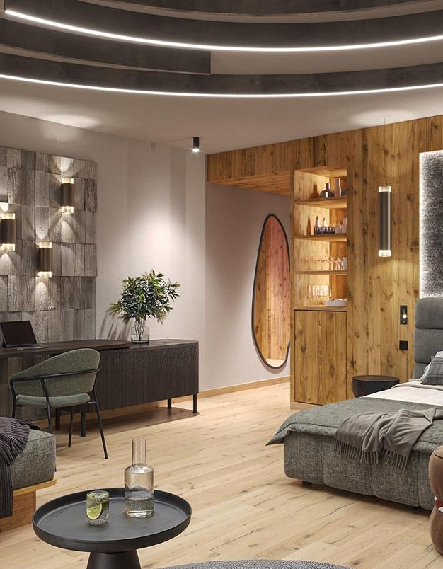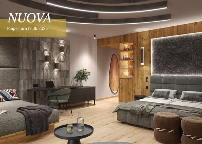 Ampio soggiorno con zona notte, moderno bagno, con ampia doccia e doppio lavabo, WC separato, asciugacapelli, bidet, WC, asciuga-asciugamani, specchio cosmetico, LCD-TV, radio, cassaforte, scrivania, minibar, telefono, wireless-internet, balcone con vasca idromassaggio riscaldata.